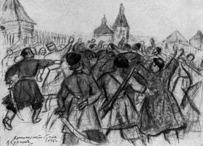 Есть сведения о том, что предки Сурикова — казаки Петр и Илья Суриковы и казаки Торгошины — принимали участие в Красноярском бунте 1695–1698 годов. В доме пращура художника, бунтаря Петра Сурикова, собиралась казачья дума, решившая покончить с несправедливостью воеводы Дурново. Бунтарский дух не угас и в потомках. И много лет спустя, уже в чиновничьем и купеческом Красноярске середины прошлого века, братья Суриковы с товарищами проучили одного войскового старшину, посягнувшего на казацкие вольности.