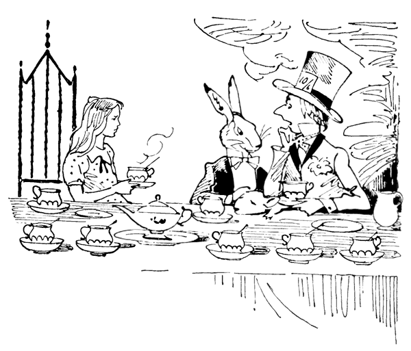 Льюис Кэролл смеется и над закоснелым бытом викторианской Англии. Вспомним сцену, где рассказывается, что для Шляпочника время остановилось. на шести часах пополудни и поэтому он (таков уж незыблемый обычай: с пяти до шести часов — чай) вместе с Мартовским Зайцем и Орешниковой Соней вынужден не переставая пить этот традиционный чай, лишь пересаживаясь после каждой новой чашки на новое место.