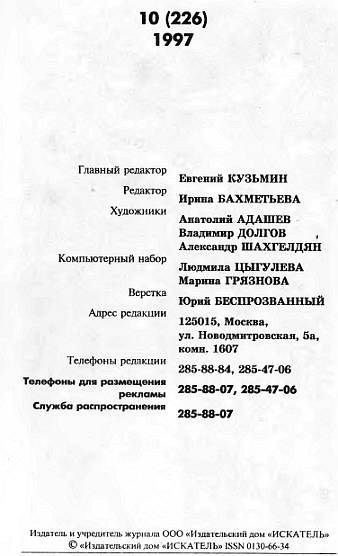Всем остальным участникам, назвавшим правильные ответы, и перечисленным выше, редакция вышлет поощрительные призы — книги серии «Сыщик» и номера журнала «Искатель» с автографами авторов.