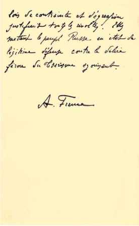 (обратно)Летом 1913 г. А. Франс посетил Россию. С 9(22) по 11(24) июля он пробыл в Петербурге и с 12(25) по 14(27) июля — в Москве. Он проявил большой интерес к русской культуре. 11(24) июля 1913 г. в газете «Петербургский листок» была напечатана статья журналиста Константина Лядова под заглавием «Знаменитый французский писатель в Петербурге», помещен портрет Анатоля Франса, а также автограф его письма к Лядову. Статья Лядова заканчивалась следующей фразой: «Просьбу… дать для „Петербургского листка“ автограф, отражающий впечатления, навеянные русской столицей, — знаменитый гость выполнил с любезной готовностью и с тем мастерством чеканного стиля, который так обаятелен в его произведениях».