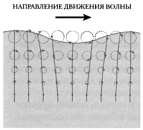 Понятно ли вам теперь, что океаническая волна — это энергия, проходящая через толщу воды? Или вы еще не разобрались? Вообще-то, воде в момент прохождения через нее энергии не свойственно подскакивать прямо вверх и обрушиваться прямо вниз (в отличие от старухи-медиума, в которую вселился дух). Если бы нам с Флорой случилось наблюдать за пучком водорослей далеко от берега, где мерно накатывают широкие волны, мы бы увидели, каким образом пучок движется в моменты прохождения гребня и подошвы волны. Приближающаяся волна слегка притягивает пучок к себе. Подошедший гребень выносит его на поверхность и в самой верхней точке подъема немного протаскивает по ходу волны. Затем водоросли погружаются вниз, увлекаемые подошвой волны, и возвращаются практически на прежнее место. При волнении вода у поверхности моря перемещается по круговой траектории.