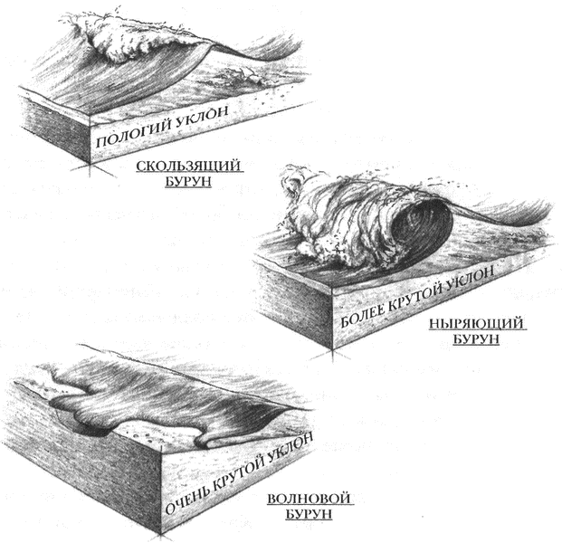 Их лебединая песнь начинается у мелководья. На глубине волнового воздействия — в половину длины волны, когда вода едва движется с волнами, — волны впервые «встречаются» с дном. Перемещение их оснований замедляется из-за трения с морским дном. Замедляясь, волны теснятся и растут, из пологих вновь становясь крутыми, с острыми, трохоидальными вершинами — совсем как в пору мятежной юности, когда яростные штормовые ветры задавали им трепку.