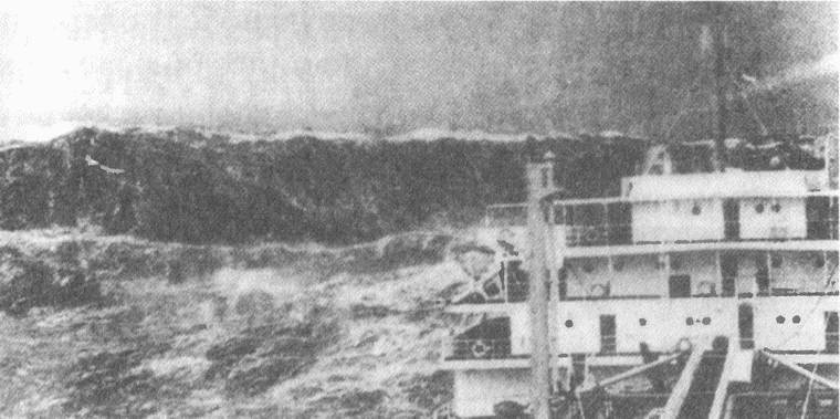 Теперь барашки виднеются повсюду. Моряки иногда называют их «белыми лошадьми». А то и «дочерьми шкипера» — видимо, потому, что к ним, как и к дочерям шкипера, лучше не приближаться, себе дороже выйдет. Пена свидетельствует о том, что волны разбиваются на глубине; мощный ветер опрокидывает их гребни. И эти растущие, изрыгающие пену волны представляют для кораблей наибольшую опасность — они не просто вздымаются, подобно крутым утесам, но и зачастую разбиваются над судном, обрушивая на его палубу тонны морской воды.