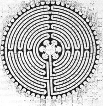 46. Благочестивым христианам, которые не могли предпринять утомительное, опасное и требующее больших расходов паломничество в Иерусалим, предлагалась альтернатива в больших соборах Северной Франции — путешествие в миниатюре и в символической форме. В церквах Амьена, Арраса, Шартра, Пуатье, Реймса, Сен-Кантена и других городов часть нефа занимает лабиринт, выложенный инкрустацией из темно-синего и белого мрамора. В Шартре его диаметр не больше 13 метров, а длина пешеходной тропы около 260 метров. Окольными путями здесь можно добраться до Иерусалима в центре лабиринта. Чтобы восполнить отсутствие подлинного Иерусалима, кающийся должен был с чтением молитв и под пение псалмов на коленях проползти по дорожкам и проходам лабиринта до самой «середины мира». Вот почему церковные лаби