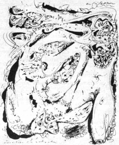 33. «Бесконечные лабиринты». Так определяет Паркер Тайлер большие абстрактные полотна Джексона Поллока, написанные в технике «дриппинга» около 1950 года. Следы стекающих и капающих красок образуют ритмическую, трудно обозримую каллиграфию, где один пласт накладывается на другой, и бесконечную, как космос или микрокосм. Из этой системы «множественных лабиринтов», наложенных один на другой, невозможно выбраться, и центр закамуфлирован и устранен умножением. «Обычный лабиринт прост, в противность ему цветная нить Ариадны в созданном Поллоком мире
