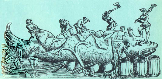 Кит дает жир, мясо и множество других полезных продуктов, причем в огромных количествах, поэтому уже в эпоху палеолита племена, обитавшие на побережьях морей, несомненно, должны были смотреть на прибитого к берегу кита как на дар богов. Орудия лова в те далекие времена были так примитивны, что нечего было и думать нападать с ними на живого кита, но тем больший взрыв ликования должны были вызывать в прибрежных поселениях те редкие случаи, когда прилив выносил на берег тушу мертвого кита.Прежде чем человек мог начать охотиться на кита, известной степени развития должны были достигнуть и мореплавание, и орудия лова, так что какие-то навыки такой охоты люди приобрели, вероятно, не ранее эпохи неолита. Скорее всего охота сводилась лишь к тому, что китобои гнали к берегу стада небольших животных. И в наше время еще охотятся подобным же образом на китов на Фарерских островах и в некоторых других районах земного шара. Эскимосы, например, когда европейцы впервые соприкоснулись с ними, да еще и много спустя, жили примерно в таких же условиях, как и люди эпохи неолита, и, по всей вероятности, эскимосские способы охоты на китов похожи на способы первобытных охотников, очень может быть, что и продукты китового промысла шли у эскимосов на те же нужды, что и у первобытных людей в далеком прошлом.Охота на крупных китов требовала гораздо более сложных приспособлений, более разнообразных знаний и высокого мастерства. Развитие ее в разных частях света шло различными путями. В Европе на крупных китов впервые начали охотиться в Бискайском заливе, который в те времена был излюбленным местом обитания больших южных гладких китов.Жившие по берегам Франции и Испании баски отправлялись на охоту в небольших лодках и били китов в прибрежных водах, не уходя далеко в море. Туша убитого животного вытаскивалась на берег и тут же свежевалась и разделывалась.Английский географ К. Р. Маркхэм, занимавшийся историей арктических исследований и китобойного промысла, в 1881 году побывал на баскском побережье и собрал там некоторые сведения о раннем периоде охоты на китов. Уже в XII веке охота эта была одним из традиционных занятий басков, началась же она по крайней мере на два столетие раньше. Король Наварры Санчо Мудрый в 1150 году пожаловал городу Сан-Себастьян право взимать пошлину за хранение на складах ряда товаров. В списке этих товаров видное место занимает китовый ус: «Налог за китовый ус... 2 динеро». Такая же привилегия была дана королем Кастилии Алонсо VIII городу Фуэнтеррабия в 1203 году, а в следующем году — городам Мотрико и Гетария. В 1237 году Фердинанд III королевским указом предоставляет такую же привилегию городу Сарагосе. Кстати, указ Фердинанда III — еще одно доказательство того, что охота на китов известна издревле: Фердинанд требует «согласно обычаю» отдавать королю от каждого убитого кита кусок мяса, вырезанный из спины животного во всю его длину — от головы до хвоста. В Гетарии существовал обычай каждого первого убитого в начале сезона охоты кита дарить королю, который — по обычаю же — половину его возвращал обратно.Еще одним доказательством того, как издавна ведется китобойный промысел и какое большое значение имел он в жизни прибрежных басков, могут служить гербы многих городов. В начале этой главы воспроизведена городская печать Биаррица, датируемая 1351