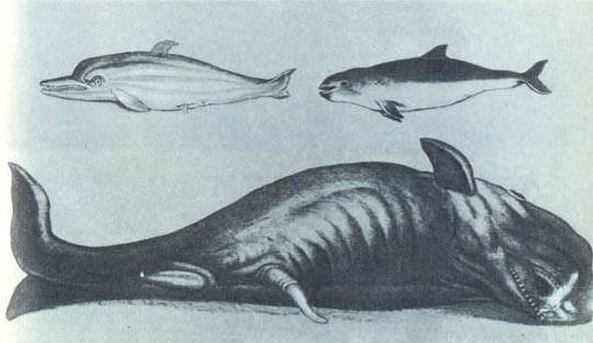 Вверху — карликовый кашалот, или когия. Изучен слабо: поймать его не удавалось, выброшенные же на берег экземпляры попадаются крайне редко. В центре — черный, или бискайский, кит, внизу — серый кит.