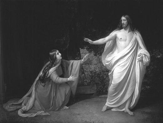 А «Явление Христа Марии Магдалине…» действительно замечательна. Сдержанный, величественный Христос. Мария – вся порыв, радость, счастье узнавания. Это один из самых возвышенных и трогательных эпизодов Святого писания – мгновение, когда Мария узнает воскресшего Христа. Все здесь – отчаяние и радость, восторг и сострадание. Христос приказывает: «Не прикасайся ко мне!.. Иди к братьям моим…» Мария замерла, преклонив колени и простирая руки к Учителю.