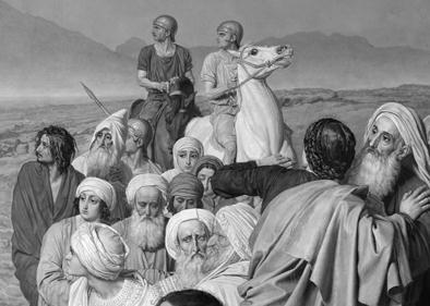 Все люди на картине образуют два потока, которые движутся в противоположных направлениях. Правосторонний устремлен вниз, по часовой стрелке. Эти люди не смотрят на Спасителя, взгляды их потуплены. Скорбные и печальные, они удаляются от одинокого путника на холме. Не то смущенье, не то страх читается на их лицах. Левый поток людей, ведомых Иоанном, движется вверх, к Христу.