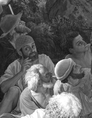 «Царствие подобно пастуху, у которого сто овец. Одна из них заблудилась. Он оставил девяносто девять и стал искать одну, пока не нашел ее». И вот уже юноша в серых одеждах устремился к Христу. Он развернулся против течения, перестал быть частью бредущей толпы. Его в чем-то убеждает старец, убеленный сединами, в чьих глазах недоверие и сомнение, но юношу не удержать. Он увидел и узнал. Кажется, какая-то невидимая нить протянулась между ним и Иисусом, и чтобы ни говорили – прочь отсюда! Ученик и Учитель нашли друг друга.