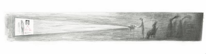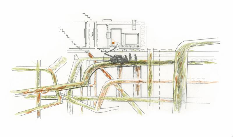 Перед нами грохочет какой-то механизм с крутящимися колесиками. От него отходит стальная рука, поднимающаяся к отверстию, которое, судя по всему, этот механизм и пробил в потолке тоннеля.