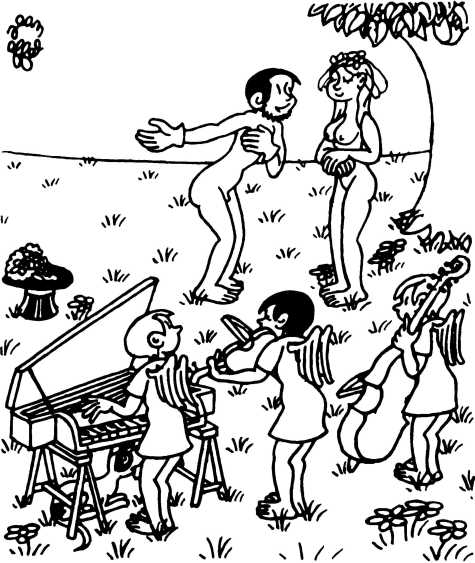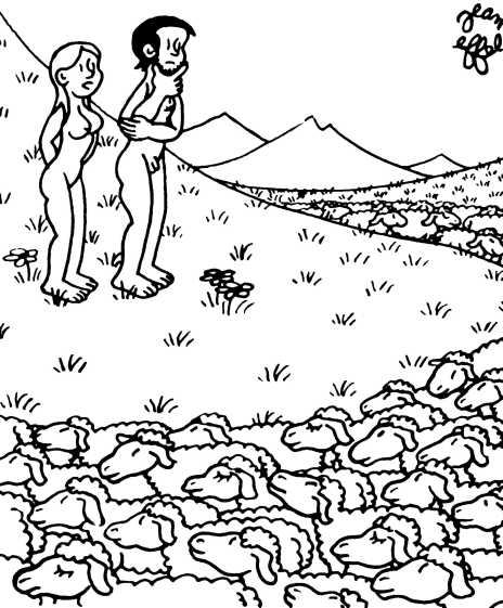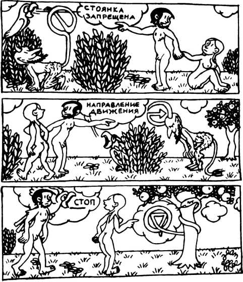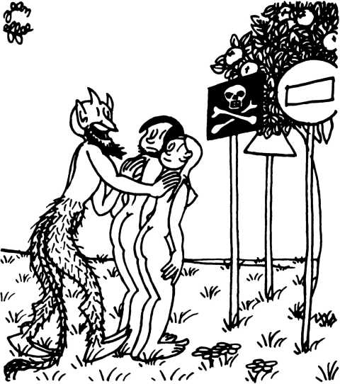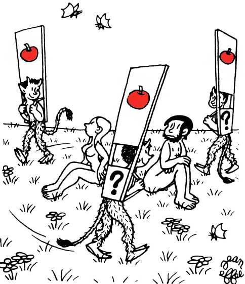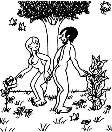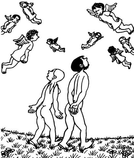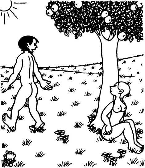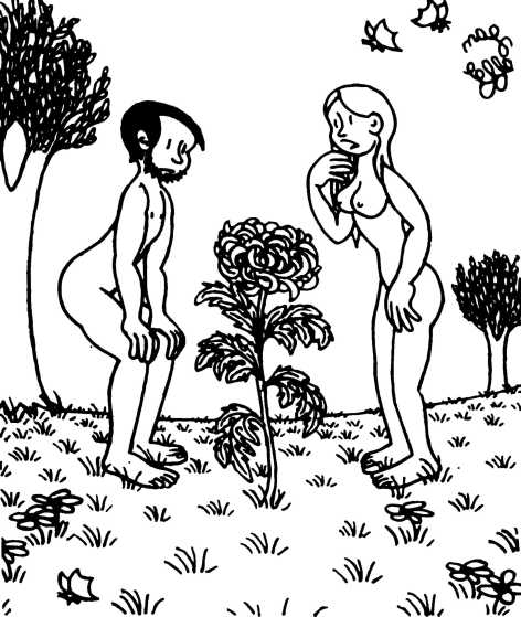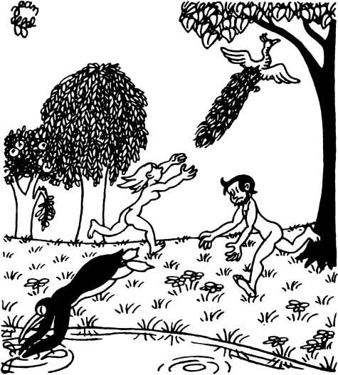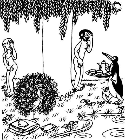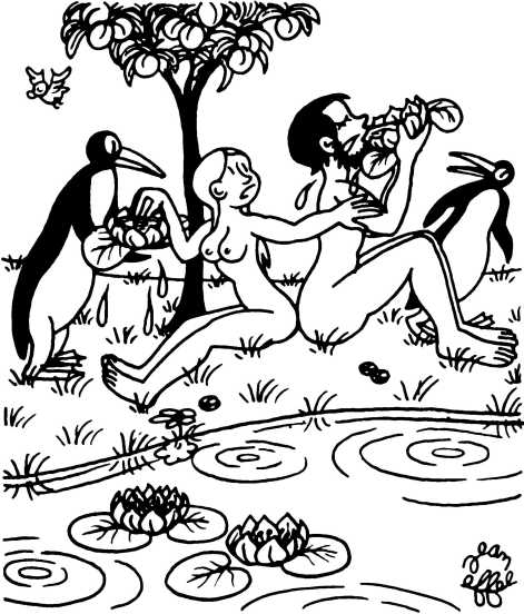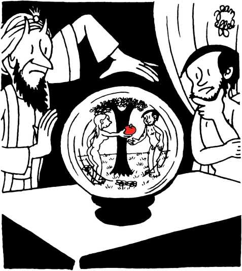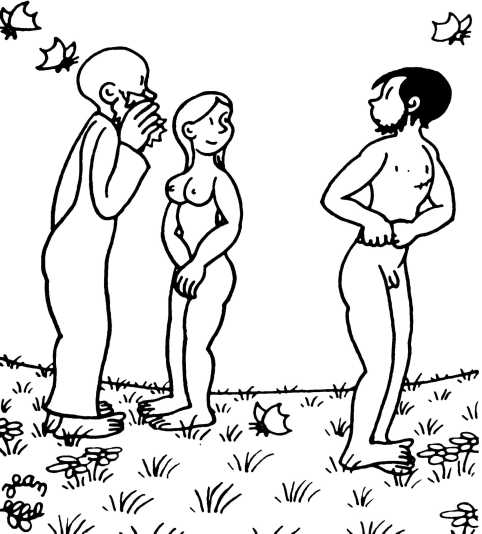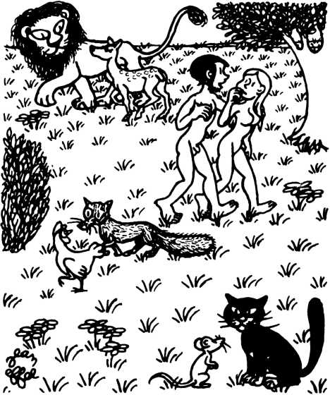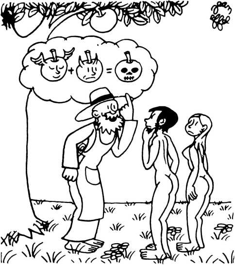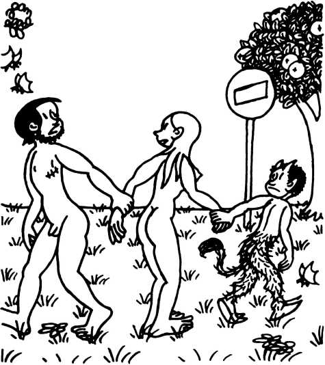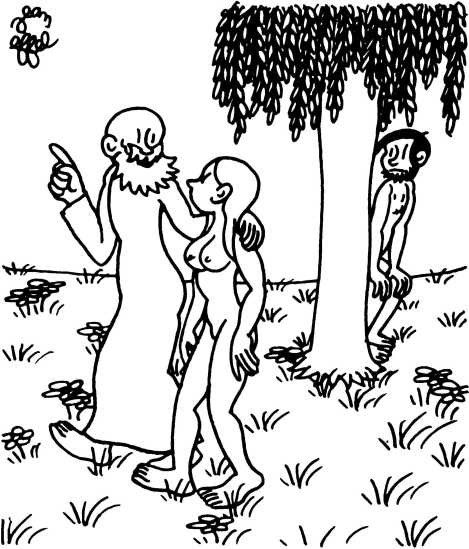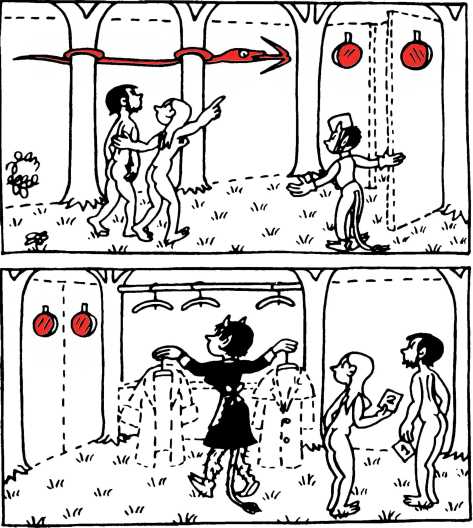 — Суд признает Еву и Адама виновными в первородном грехе и приговаривает их к смерти (условно) и к изгнанию из земного рая.