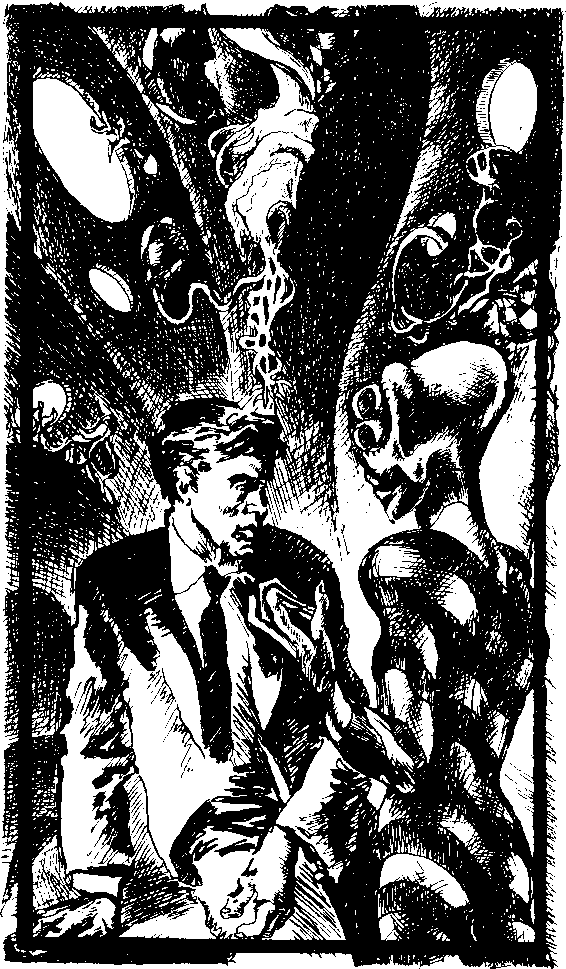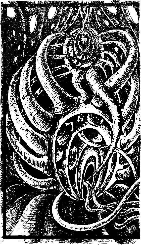 Мех, стоявший словно экспонат в музейной витрине, был человекообразным существом, обитавшим в своем первоначальном виде на планете Этамин-10. Его жесткая бронзово-ржавая шкура жирно поблескивала, будто смазанная маслом. Торчавшие из головы и шеи колечки сверкали, словно золото, — на самом деле они были покрыты бледно-розовой хромовой пленкой, Органы чувств были собраны на месте человеческих ушей. Его лицо — оно часто вызывало шок у гулявших по нижним коридорам, если они вдруг натыкались на Меха, — было сморщенным мускулом, схожим по виду с обнаженным человеческим мозгом. Его «рот» — вертикальная неровная щель в основании «лица» — был органом устаревшим — из-за вживленного под кожу у основания шеи, скромного мешочка для питательного сиропа, в результате органы пищеварения, первоначально использовавшиеся для переваривания питательных веществ из разложившихся болотных растений, атрофировались.