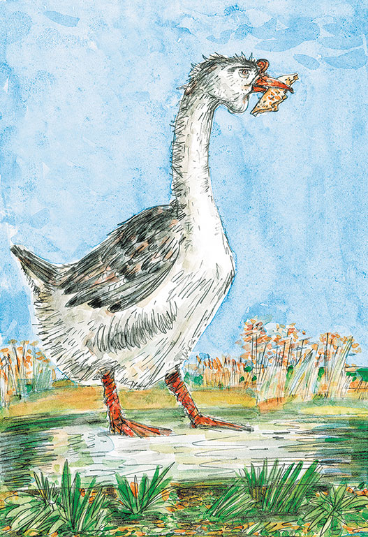 Один гусь гулял во дворе и нашел сухую корку хлеба.