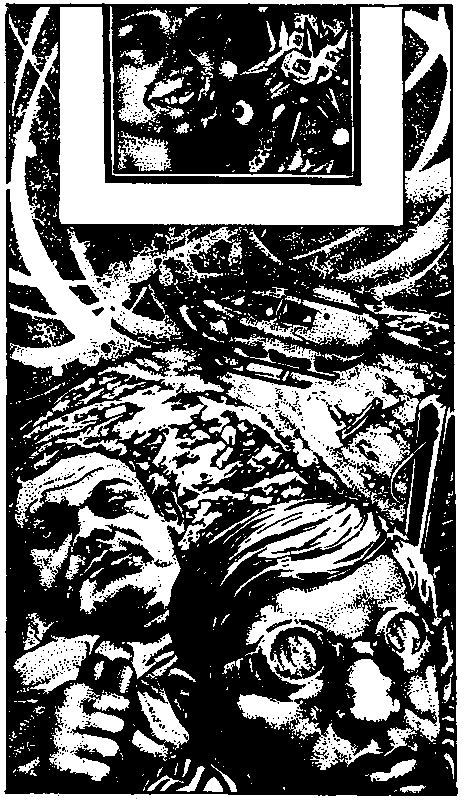 Очнулся он спустя несколько секунд. В голове гудело, сверкало, звенело; перед глазами мельтешили какие-то призрачные лица, геометрические фигуры и цветные пятна — «следы» памяти Шаламова; в ушах шумел прибой странных звуков — не реальных, а мысленных, потому что Мальгин одновременно осознавал, что вокруг стоит тишина. Он повернул голову: Шаламова в кабине не было, его эмкан валялся на сиденье. Голову пронзила острая, как заноза, тревога. Мальгин встал, его шатнуло, в глазах поплыло, но он заставил себя выбраться из кабины. Открывшаяся картина запечатлелась в памяти предельно ярко и четко: Купава,зажавшая рот рукой и протягивающая другую в сторону Даниила; сам Шаламов, пригнувшийся, неестественно растопырившийся, оглядывающийся на недалекие кусты; «черный человек» с орилоунским «глазастым» фантомом; Ромашин в необычном блестящем шлеме и телескопических очках, выглядывающий из-за кустов, и Марсель Гзаронваль, наполовину вылезший из-за обрыва с подводным ружьем в руках.