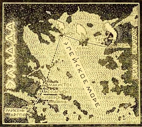 В ночь победы, на горе Иде, что недалеко от Трои, греки зажгли костер. Когда этот условный сигнал был замечен на острове Лемносе, там тотчас же развели второй костер. Вскоре вспыхнул и третий — на Афонском утесе. Оттуда огненная весть помчалась на остров Эвбею и перескочила с моря на сушу. А дальше путь лежал через горные вершины Киферона и Эгипланкта, через высоты Арахнейские прямо к царскому замку в Микенах.