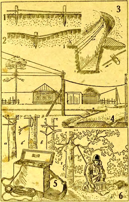 Как прокладывают телефонный кабель: 1 — крепление кабеля колышками на ровной почве, 2 — крепление кабеля в складках местности, 3 — прокладка кабеля в ходе сообщения, 4 — прокладка линии в населенных пунктах и переход линии через дорогу, 5 — полевой телефонный аппарат, 6—телефонист проверяет исправленную линию