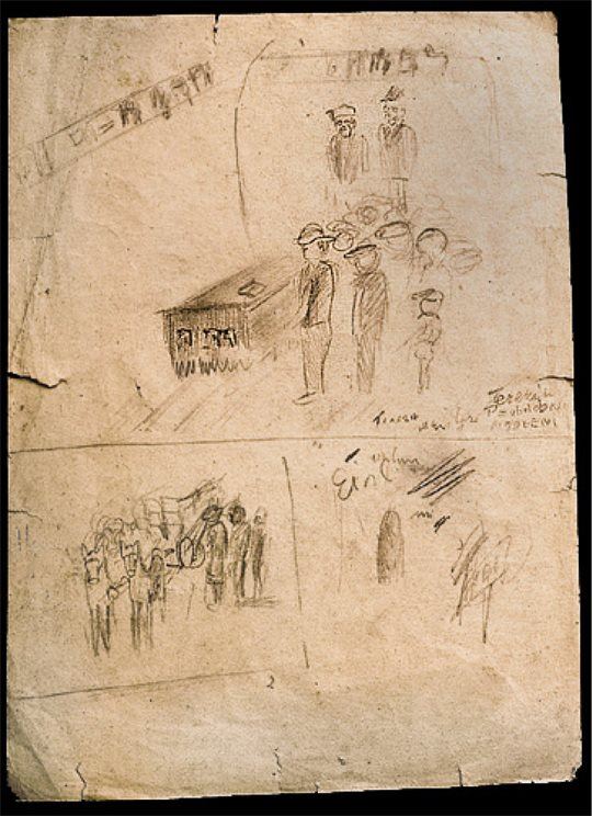 «…Вечером 5 октября нас погрузили в поезд, не в скотовоз, а в очень хороший. Правда, из-за вещей в вагоне было тесно. Нас было 1550 человек, в основном женщины и дети. Еще матери с младенцами, которые родились в Терезине. Это мы сочли добрым знаком – не станут же немцы убивать грудных детей! Мы верили, что едем в новый лагерь, к отцу. Беспокоились только за вещи. На всякий случай мы надели на себя все, что только можно, и очень страдали от жары, тем более что погода стояла теплая. На терезинском перроне нам велели снять с шеи номера. Какая радость – значит, мы больше не числа. Рано утром 6-го поезд тронулся в путь. Каждому на дорогу дали батон хлеба и что-то вроде колбасы. Мы думали, что вечером уже будем на месте. Где это место, никто не знал, и все постоянно об этом говорили. Иногда мы ненадолго засыпали и тут же просыпались в испуге, все было как-то странно. Когда поезд останавливался, мы наполняли водой бутылки или кружки. Пробираться в уборную через тюки и чемоданы было настоящей мукой.