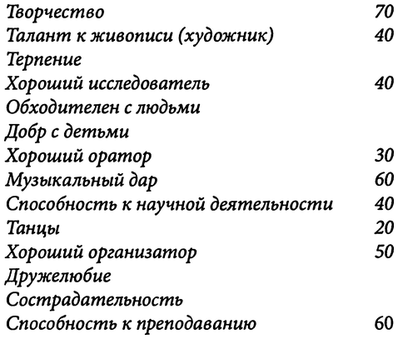 Например, приведенный выше перечень показывает, что особую радость человеку доставляет творческий талант, особенно живопись, которую он оценивает в 95 баллов.