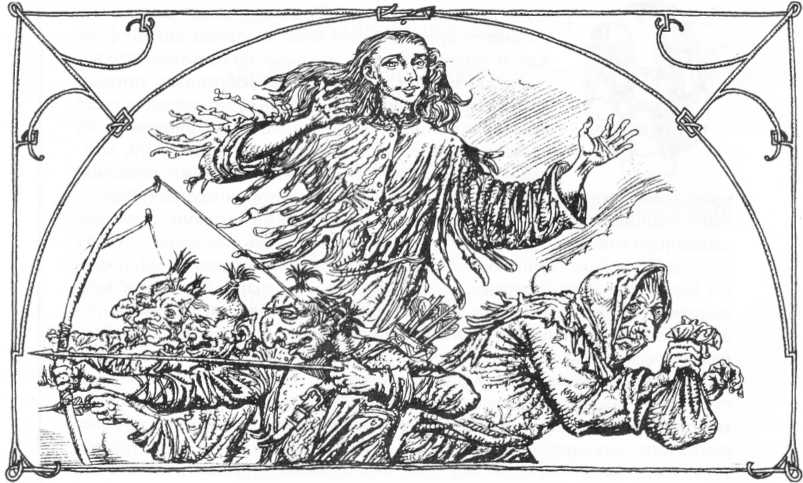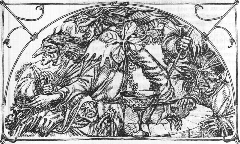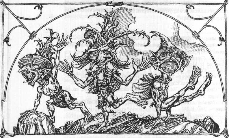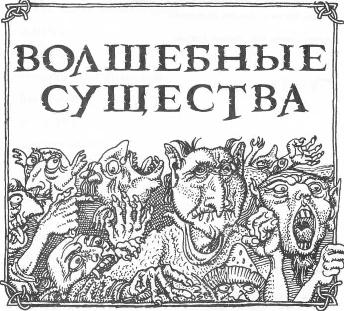 Феи (Feiries). Слово «феи» появилось сравнительно недавно; более раннее наименование, фай, сегодня звучит архаично и напыщенно. В нем улавливают отголоски искаженного fatae, что значит «парки». Три парки классического периода размножились и превратились в сверхъестественных особ женского пола, которые управляли судьбами людей и присутствовали во время родов. Словом «фай» в старину обозначали состояние зачарованности, когда человеку отводили глаза, и лишь позднее его стали применять к существам, которые это делали. В наше время термин «феи» применяется чрезвычайно широко: им обозначают эльфов англосаксонской и скандинавской мифологии, мирный народ Горной Шотландии, ирландские племена богини Дану, добрую семейку Уэльса, благословенный и неблагословенный дворы, добрых соседей и многих других. Феи, живущие племенами, и духи-одиночки тоже входят в их число; размер не имеет значения, — фея может быть саженного росту, может не доставать человеку до плеча, а может быть и совсем малюткой; не важно, где она живет — в доме, под землей, в озере, ручье или море, и в каких отношениях с людьми состоит. Всякого рода карги, чудища и буки причисляются обычно к другой категории, так же как и волшебные животные.