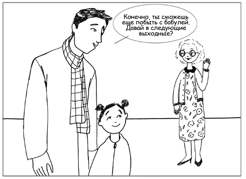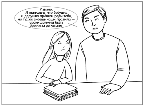 Если речь идет о маленьком ребенке, достижение первой цели – готовности к сотрудничеству – может выражаться в том, что малыш дает вам руку, когда надо перейти дорогу, или соглашается вернуть на полку в магазине бутылку оливкового масла, которая должна была изобразить бейсбольную биту. С ребенком постарше это значит, что вы можете обсудить и вместе выработать меры по соблюдению режима дня или объяснить ему, каково было старшей сестре услышать от него: «Ты, зубрилка толстозадая!»