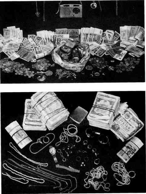 Деньги и драгоценности, изъятые у спекулянтов валютой.