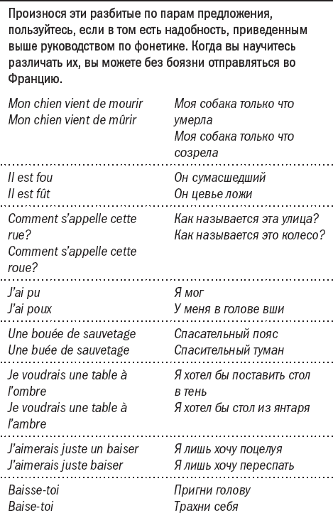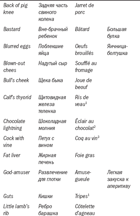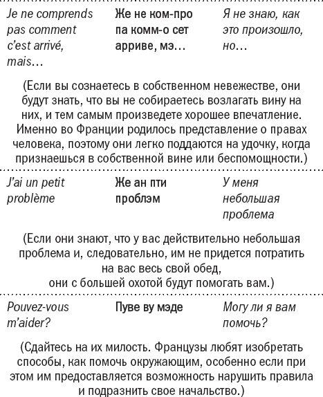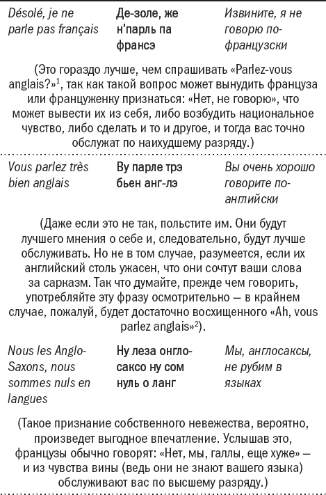 (обратно)В конце главы вы найдете несколько жизненно необходимых французских слов и выражений для тех, кто не в ладах с французским языком, но тем не менее хочет, чтобы его обслужили. Используйте их, и вам, возможно, принесут заказ.