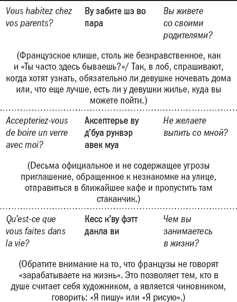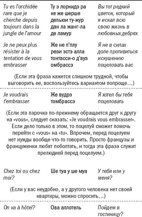 (обратно)Чисто практическое замечание: женщине, принявшей приглашение на ужин, пожалуй, следует прихватить с собой упаковку контрацептивных средств (préservatifs, произносится как «пре серв атиф»), поскольку большинство французских мужчин не имеют ни малейшего понятия об их существовании. Также ей не следует (потом) поддаваться на уловку французских мужчин, уверяющих, будто у них «аллергия на презервативы».