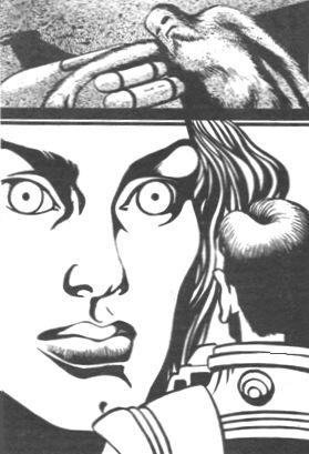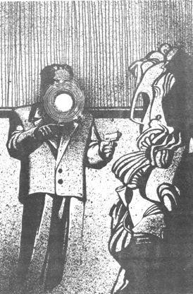 Подойдя к краю шеренги «кустарей», изготовлявших вручную всякую всячину от сапожных гвоздей до средства от насморка, он заметил странную личность в непонятном одеянии, державшую в руках блестящую штуковину с рычагом. «Личность» была на вид худа и невзрачна, многодневная, но редкая щетина не могла скрыть под собой горную складчатость лица, громадные черные брови прятали в пропастях глазниц темные омуты глаз. «Леший! — решил про себя Константин. — И не боится при народе!..»