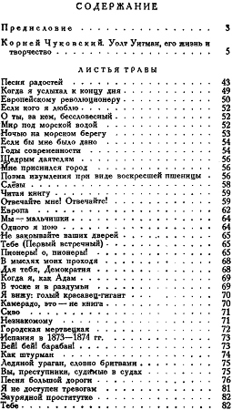Переводя Уитмана, я отнюдь не стремился к тому, чтобы дать буквальный подстрочник. Подобные подстрочники при переводе произведений поэзии бывают меньше всего адекватны оригинальному тексту. В буквальном переводе строки стихотворений Уитмана, и без того очень длинные, выходят по-русски чуть не втрое длиннее и теряют весь свой лаконизм, так как русские слова значительно длиннее английских и, кроме того, английский синтаксис сжимает фразу до крайних пределов, что несвойственно нашему синтаксису. Когда Уитман, например, говорит: