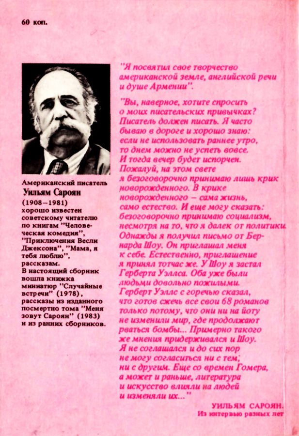 Американский писатель Уильям Сароян (1908–1981) хорошо известен советскому читателю по книгам «Человеческая комедия», «Приключения Весли Джексона», «Мама, я тебя люблю», рассказам.