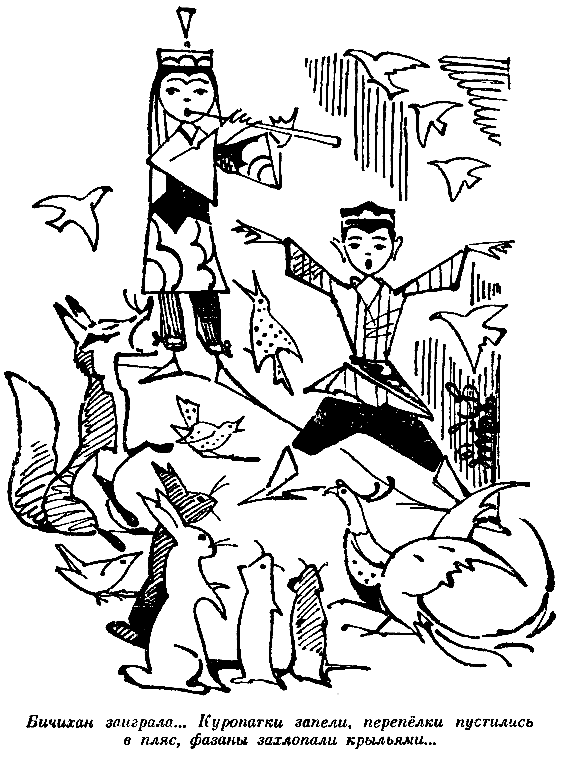 — Ну, друзья, готовьте мне подарок — суюнче. Я принёс вам радостную весть, — сказал он куклам, переступив порог, и все куклы, и те, что сидели на одеяльце, и те, что стояли на полках, разом заговорили: