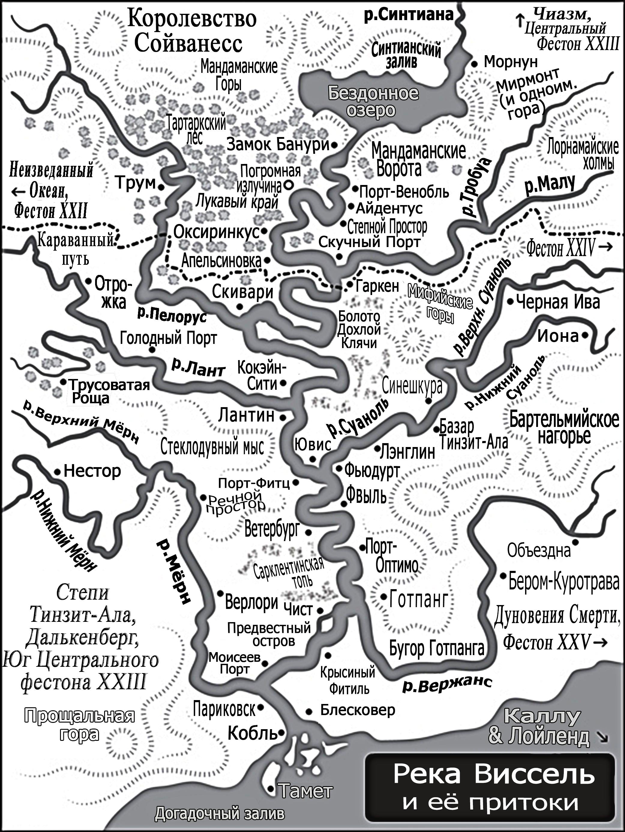 На следующий день судно миновало города Ветербург и Фвыль, а ближе к вечеру пришвартовалось во Фьюдурте — в месте впадения Суаноля в Виссель. Как правило, Замп не плавал на север дальше Фьюдурта, первоначально основанного купцами в качестве перевалочного пункта для грузов и товаров, доставленных вниз по течению Суаноля с Бартельмийского нагорья; отсутствие в этом городе каких-либо загадочных предрассудков или капризных запретов было, само по себе, почти уникальной особенностью.