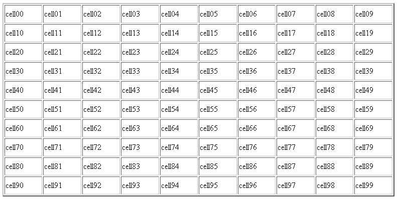 Помните пример из прошлой главы? Там мы рисовали табличку из четырёх ячеек на чистом HTML. Глава закончилась на том, что для создания таблицы 10х 10 ячеек будет нужно 210 строк внутри основных тэгов. Посмотрим, сумеем–ли мы сделать текст более компактны с помощью JavaScript.
