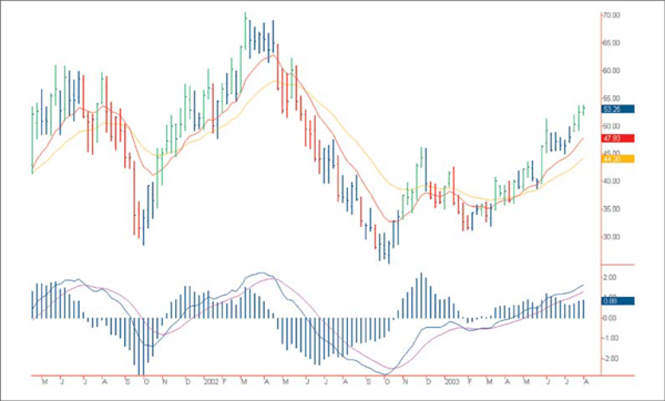 Я увеличила длинную позицию 2 сентября 2003 г. Акция хорошо росла, но потом перешла в горизонтальный коридор. Через четыре торговых дня она прорвала коридор на необычно высоком объеме. RSI рос, MACD был силен, да и стохастический индикатор продолжал подъем. Все говорило в пользу моего решения, но самым весомым был прорыв вверх на высоком объеме.