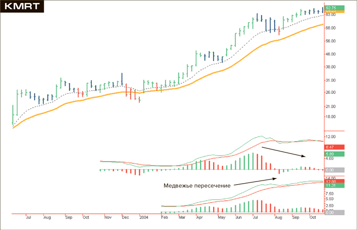 Автор индикатора «схождения/расхождения скользящих средних» (Moving Average Convergence-Divergence, MACD) – Джеральд Аппель (см. главу 7). Быстрая линия MACD представляет краткосрочный консенсус относительно стоимости, а медленная – долгосрочный. Когда быстрая линия поднимается над медленной, это показывает, что на рынке властвуют быки. Когда быстрая линия опускается ниже медленной, это свидетельствует о власти медведей.