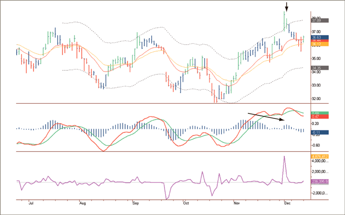 Есть несколько типов конвертов, из которых мне лично больше нравится простой конверт: две линии, идущие параллельно ЕМА, одна выше, а другая ниже скользящей средней. Правильно построенный конверт, как хорошо сидящая рубашка, охватывает массив цен, выпуская наружу только экстремумы – шею и запястья. Новички любят покупать на прорывах, профессионалы обычно ищут возможности для покупки у нижней границы конверта, а для короткой продажи – у верхней.