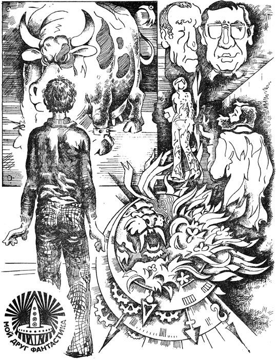 Первое, что бросилось в глаза Крылечкину, когда он переступил порог комнаты, был начертанный на стене лозунг: «Повышение коэффициента свирепости — ключ к надежной хищникоустойчивости». А чуть ниже задача была сформулирована более конкретно: «Неустанно наращивать силу копытного удара!» Под этими поразившими Крылечкина словами стоял длинный белый стол, заставленный штативами с разноцветными пробирками. Вообще пробирками и банками с притертыми пробками была заставлена вся комната: они виднелись и на полках, и в шкафах, и на холодильнике, и на тумбочке рядом с электронным микроскопом; одна такая банка, наполненная свекольного цвета жидкостью, стояла даже на титанитовом плече кибер-лаборанта, недвижимо замершего в углу возле пульта, от которого тянулись провода в смежное помещение, — через открытую дверь был виден угол кормушки, и даже сквозь густоту сиреневого благоухания ноздри улавливали кисловатый силосный запашок.