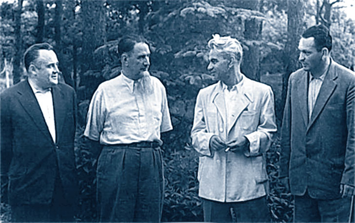 Слева направо: академики С. П. Королев, И. В. Курчатов, М. В. Келдыш и В. П. Мишин