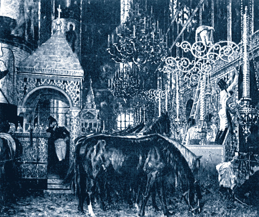 Однако богомольную Москву пугало другое – страсть нового царя к веселым потехам и забавам. Народ тешили скоморохи, плясуны, дрессированные медведи, а за обедом у царя играла «богомерзская» музыка. По Москве поползли слухи, что самозванец-богохульник заключил союз с самим Сатаной и хочет отдаться под власть Папы Римского. В народной памяти образ «Гришки-Расстрижки» сохранился в балладах и легендах, где он неизменно предстает в роли колдуна, чернокнижника, с помощью нечистой силы захватившего власть над Москвой.