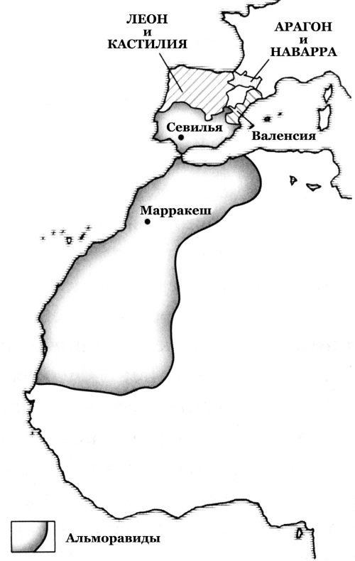 (обратно)Альфонсо Воитель не был кровным родственником Альфонсо VI Кастильского. Он происходил из рода правителей Наварры, а права на Кастилию и Леон предъявлял по той причине, что женился на дочери Альфонсо VI Урраке, которая по смерти отца стала правительницей королевства. Таким образом, он был не племянником, а зятем короля. Причем об этом рассказывается ниже, то есть автор сам запутался в родственных отношениях. (Прим. ред.)