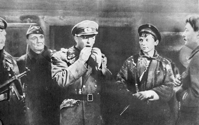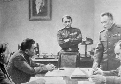 Он собирается было отойти от стола, но Семиренко останавливает его, и Млынский становится рядом с ним и генералом, который продолжает читать указ: