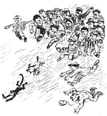 Два малыша, сорвавшись со скамейки, бросились вслед за прохожим. Но тот, ожидая от ребят, должно быть, какого-нибудь подвоха, усилил шаг. И, отмахиваясь от ребят рукой и чертыхаясь, удалился.