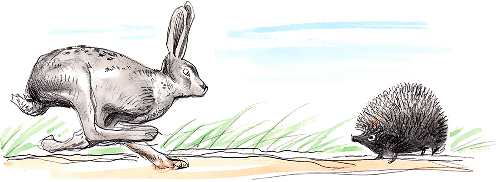 Заяц не узнал ежову жену от ежа и думает: «Что за чудо! Как это он меня обогнал?»