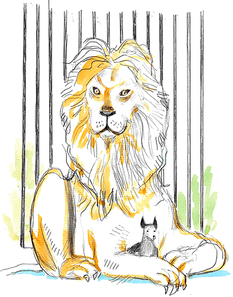 Потом охотники поймали льва и привязали верёвкой к дереву. Мышь услыхала львиный рёв, прибежала, перегрызла верёвку и сказала: