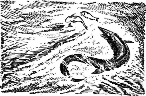 «Это было в 1909 году, — пишет Барш. — Я крейсировал на маленьком ботике у берегов острова Борнео. Море было совершенно спокойно. Вдруг мой помощник вскрикнул от испуга и изумления. Я вперил взор туда же, куда и он, и также замер на месте. На поверхности воды, ясно освещенные тропическим солнцем, извивались петли гигантской змеи. Я схватился за бинокль и убедился, что это была стая дельфинов, выпрыгивавших из воды, как бы догоняя друг друга. Профан или впечатлительный человек, конечно, примет эту вереницу за змею».