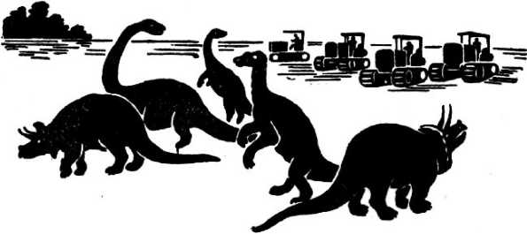 Снова в воздухе загудел мотор. И на луг перед загоном сел самолет. Летчик доложил, что в осиновой роще обнаружен мегалозавр. Это близко, не более трех километров. Тракторы снялись с места и вереницей пошли к указанному пункту. Самолет ушел в воздух.