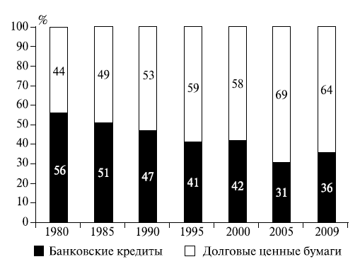 Процесс секьюритизации носит глобальный характер и охватывает как развитые, так и развивающиеся рынки. Этот процесс зародился в США, и идет очень бурными темпами. Если в 1970 г. в США доля заемных ресурсов, привлеченных нефинансовыми компаниями за счет эмиссии облигаций, составила всего 42 %, а большая часть (58 %) приходилась на банковские кредиты, то в настоящее время картина на кредитном рынке противоположная. В 2009 г. на долю облигационных займов приходится 64 %, а удельный вес банковских кредитов сократился до 36 % (рис. 1.2).