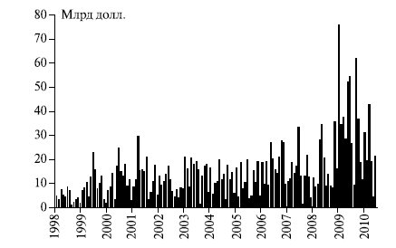 Аналогичная картина наблюдается и на российском финансовом рынке. Объемы выпуска корпоративных облигаций постоянно увеличиваются и растут опережающими темпами по сравнению с банковскими кредитами. На рис. 1.3 показана динамика выпуска корпоративных облигаций.