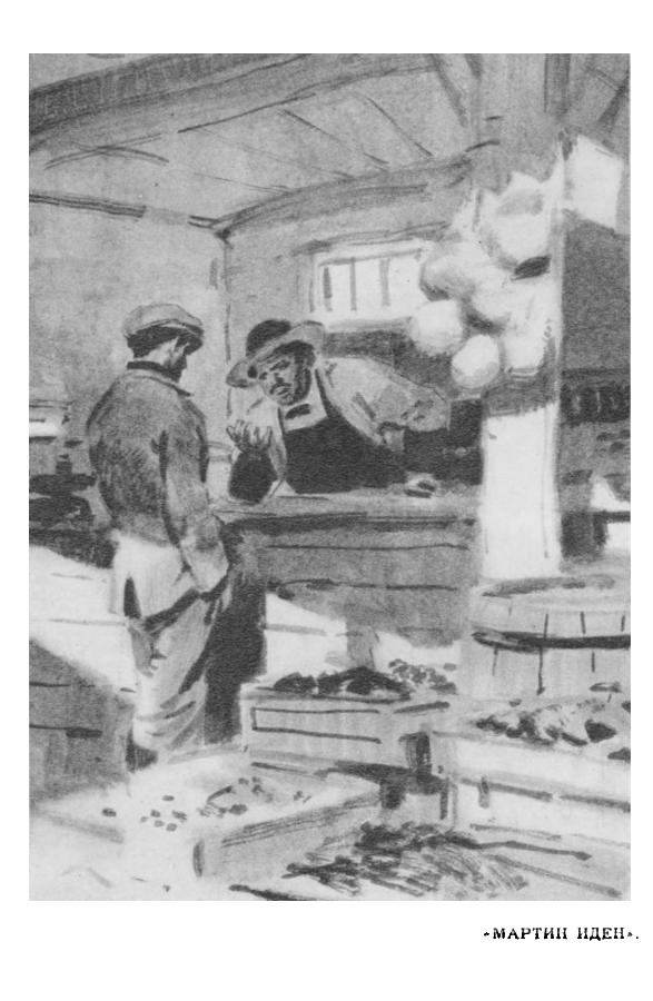 Его внимание привлекла картина на стене, писанная маслом. Могучий вал разбивался о прибрежную скалу; низкие, грозовые облака покрывали небо, а по бушующим волнам, освещенная закатными лучами, неслась маленькая шхуна, сильно накренившись, так, что вся ее палуба была открыта взгляду. Это было красиво, а красота неодолимо влекла его. Он забыл о своей неуклюжей походке и подошел к картине вплотную. Красоты как не бывало. Он с недоумением взирал на то, что теперь казалось грубой мазней. Затем он отошел. И тотчас же картина снова стала прекрасной. «Картина с фокусом», — решил он, отворачиваясь, и среди новых нахлынувших впечатлений успел с негодованием подумать о том, что столько красоты принесено в жертву ради глупого фокуса. Он не имел понятия о живописи. До сих пор он знал лишь хромолитографии, которые были одинаково гладки и отчетливы издали и вблизи. Правда, в витринах магазинов он видал картины, написанные красками, но стекло не позволяло разглядеть их как следует.